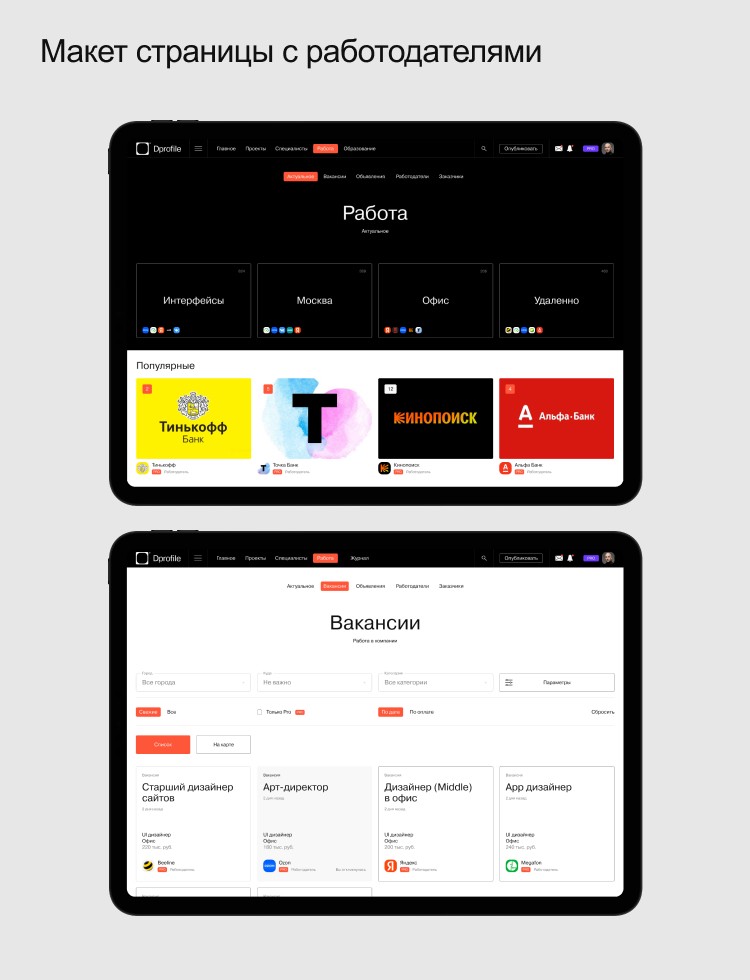 Хотя полноценный функционал с вакансиями мы ещё не запустили, работодатели уже начали обращаться к нам. Чтобы не терять эти обращения, мы создали телеграм-канал «Dprofile . Работа», где размещаем вакансии для дизайнеров бесплатно. На канале уже четырёх тысяч подписчиков.