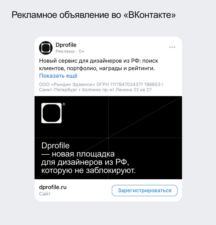 Во «ВКонтакте» часть объявлений ведёт на регистрацию на Dprofile, а часть — на подписку на нашу группу, что позволяет нам увеличить количество подписчиков.